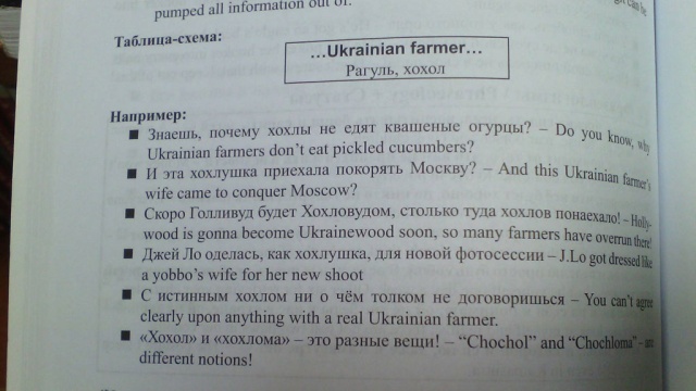 Житель Львова рассказал в Facebook, что нашел в одном из книжных магазинов города учебник разговорного английского языка с вкладышем о нецензурной лексике, в котором содержится слово «хохол». В табличке-схеме таким образом объясняется словосочетание ukrainian farmer (в дословном переводе — «украинский фермер»). Лента.Ру »