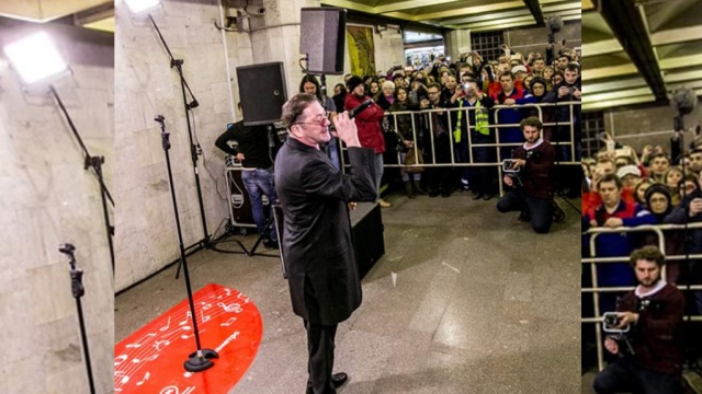 Певец Григорий Лепс устроил концерт в переходе метро между станциями «Арбатская», «Боровицкая» и «Библиотека им. Ленина». Музыкант, стоя возле наклеенной на полу надписью «#музыкавметро», спел пять песен, в том числе и самые известные: «Рюмка водки на столе» и «Самый лучший день». Лента.Ру »
