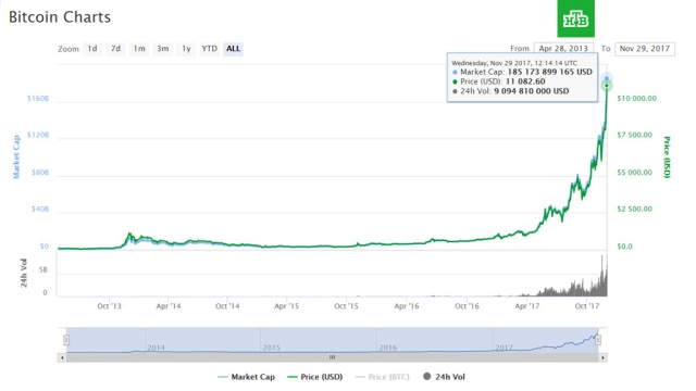 Криптовалюта биткоин в ходе торгов превысила отметку в $11 тыс.