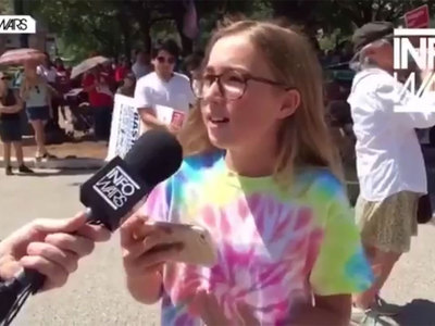Журналист интернет-проекта InfoWars, также известный как «главный конспирологический сайт Америки», попытался взять интервью у девочки, на что получил в ответ оскорбления. Короткое интервью было записано на митинге в Техасе, на заднем плане стояла группа людей с транспарантами и ЛГБТ-флагами. Лента.Ру »